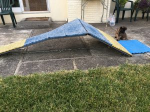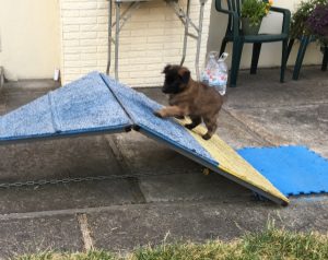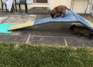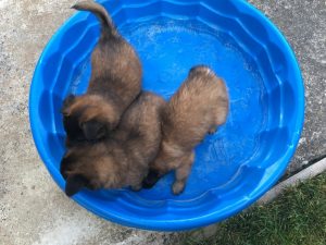 Puppies playing in the backyard on 4/29/20. The pool had been filled the day before. I had lured 3 of the puppies (Leo, Pink, and Mona) over the contact trainer the day before with a toy. Here’s Leo trying it out on his own! I switched to video, so didn’t get him coming all the way down (he did bail off the side a little early). Pink girl had a great time today going up and over it, as well as did a few other puppies! I put a few more mats on the sides.  I’m trying to load a short video (20 seconds) of the puppies playing in the pool to my AKC Marketplace Listing.