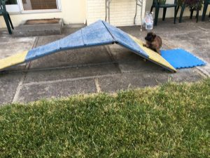 Blue boy thinking about climbing the contact trainer. The ears are starting to come up!