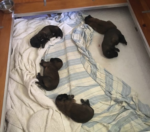 12-Day Old Puppies on 4/1/20. From top left corner going counter-clockwise – pink girl. blue boy, chocolate girl, gray girl, yellow girl. Lion boy is under rail at left.